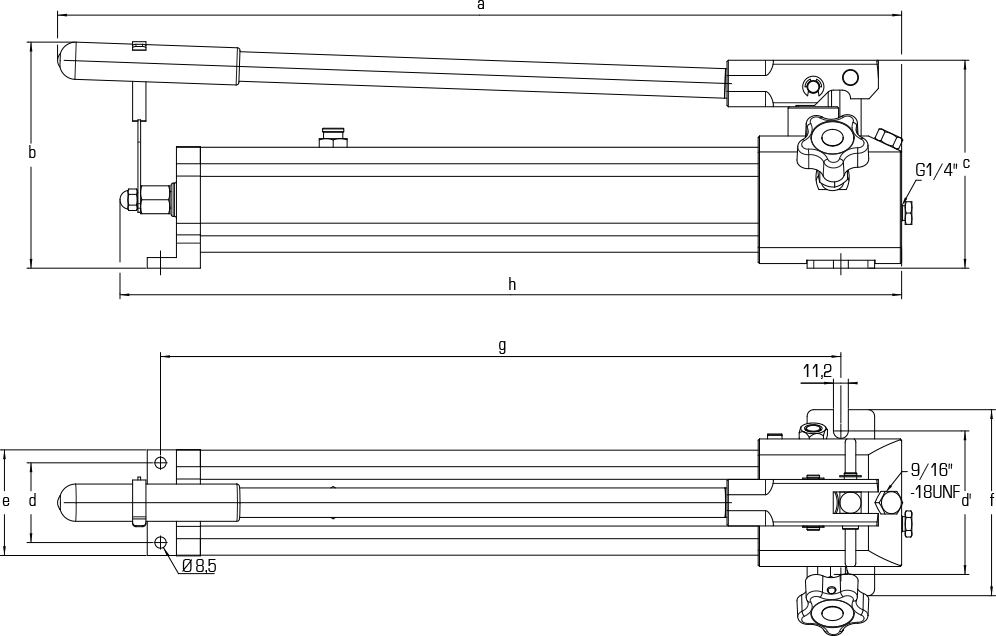 | For cylinder | Pressure | Oil flow | Max pressure | Oil flow | Oil capacity | Max handle effort | Reference | Dimensions (mm) | Weight | |||||||||